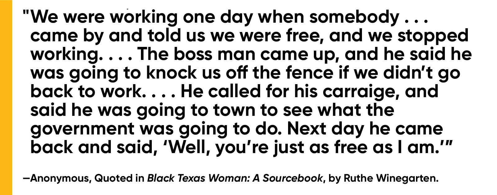 In 1863, the Emancipation Proclamation declared all enslaved people in the rebelling states free. Because Texas was still under Confederate control at that time, Union forces could not enforce the Proclamation in the state until Union General Gordon Granger landed at Galveston on June 19, 1865, and read the order. In Texas, June 19 came to be known as Juneteenth, on which day Black Americans celebrated their freedom.