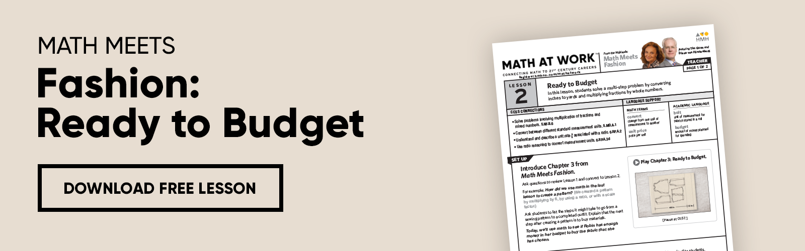 In the "Math Meets Fashion" episode of Math at Work, Jessalyn (14), Drew (16), and Robin (18) explore math in the fashion industry by meeting with Tim Gunn, former co-host of Project Runway and current co-host of Making the Cut, and Diane von Furstenberg, legendary fashion designer and president of the Council of Fashion Designers of America.